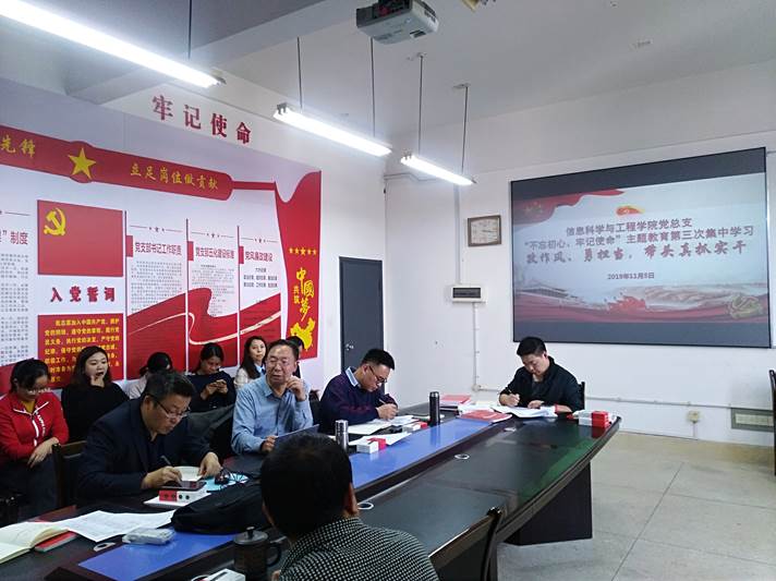 11月5日15时,信息科学与工程学院党总支部“不忘初心、牢记使命”主题教育第三次集中学习活动在玉衡楼北407举行。首先,党总支书记王杰文同志强调各党支部要结合“五化建设”,认真落实主题学习各项要求,组织党员对照党章党规按照“十八个是否”找准差距,检视问题,积极整改。随后,党总支副书记成夏炎同志围绕 “改作风、勇担当,带头真抓实干”作了主题发言,强调作为一名高校教育工作者,我们的初心与使命就是立德树人,为党育才,为国育人,也就是为培养中国特色社会主义的合格建设者和可靠接班人而努力。希望必赢官网全体教师居安思危,利用这次主题教育的机会,找准差距逐一落实,改作风、勇担当,带头真抓实干,成为一名传其以德,授之以学,解其之惑的合格教师。