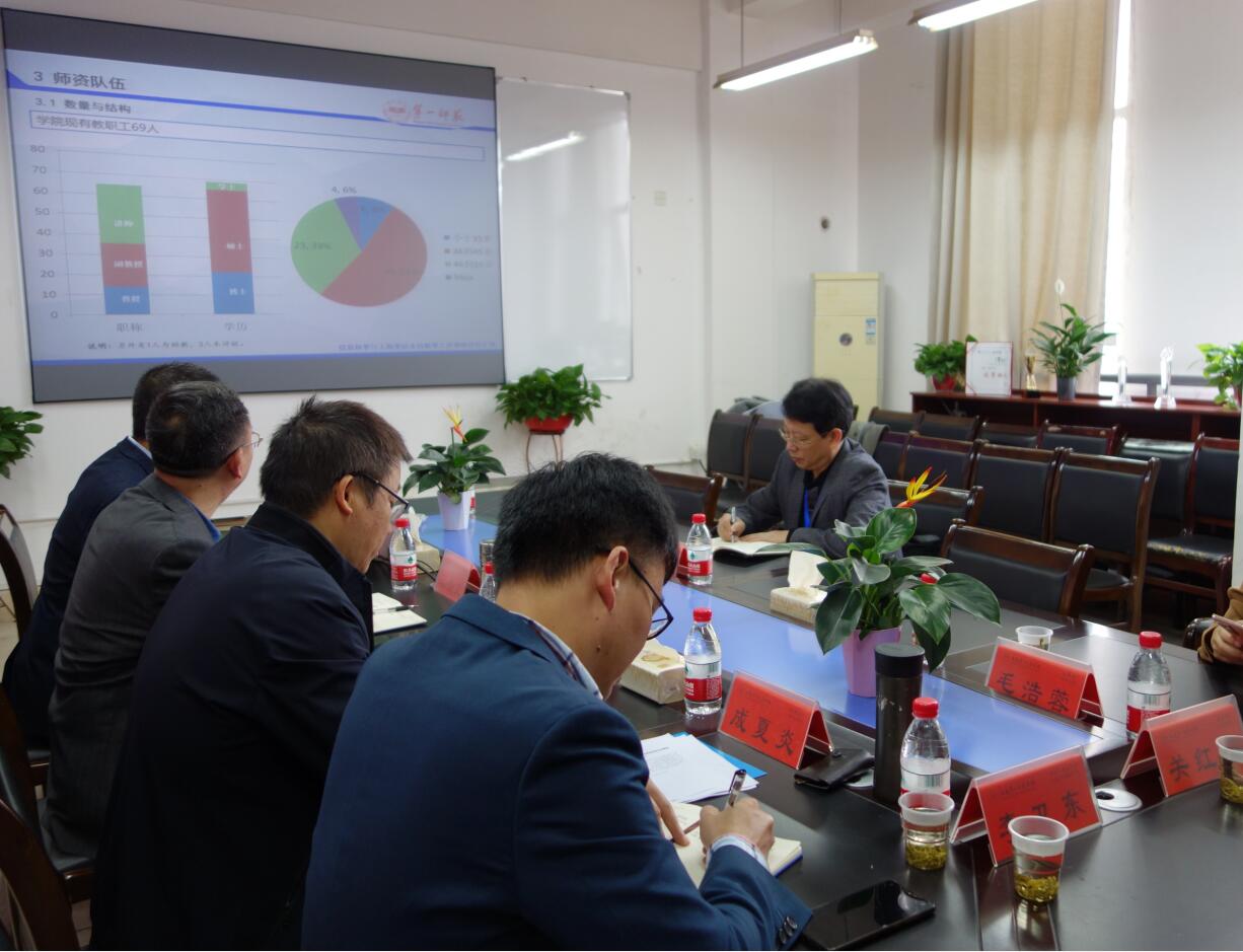 会上,副院长何向阳教授从学院概况、办学定位及举措与成效、办学特色、存在的问题与反思等四个方面进行了汇报,党总支副书记成夏炎博士就学生工作特色——“一轴四驱”育人体系作了介绍。