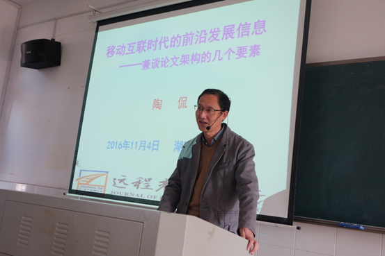 11月4日,中国教育技术协会理事,中国教育技术协会期刊专业委员会副主任,中国教育技术协会教育游戏分会副理事长,华人探究学习协会理事,《远程教育杂志》(CSSCI)执行副主编兼编辑部主任陶侃教授应邀来必赢官网讲学,为200余名师生作了以“移动互联时代的前沿发展信息——兼谈论文架构的几个要素”为主题的学术报告。校长助理、信息科学与工程学院院长李勇帆教授主持报告会。