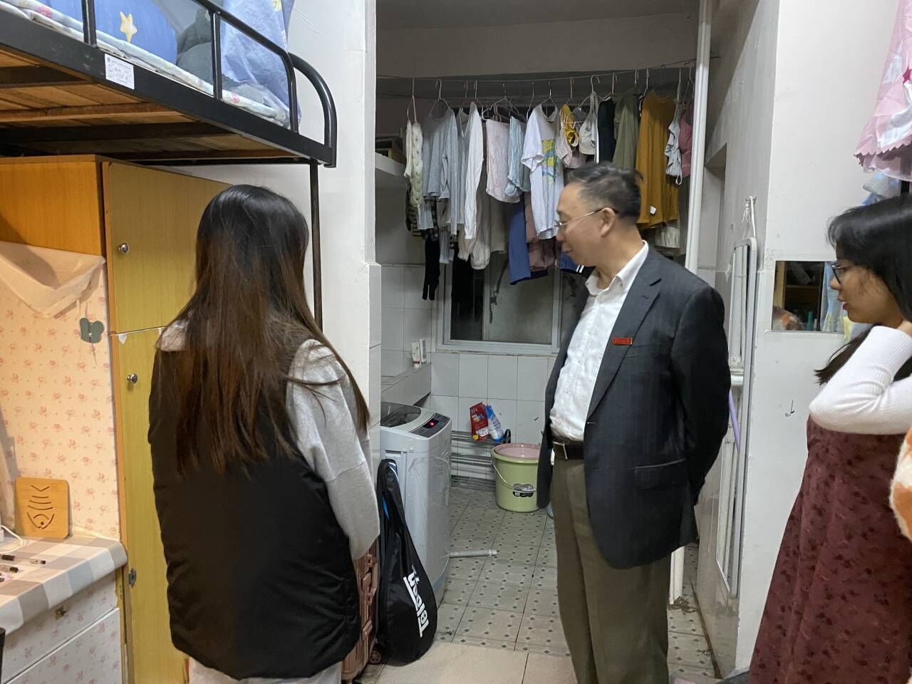 田祖伟院长在查看内务的同时也不忘关心学生:“同学们在平时的生活中不仅要友爱互助,更要重视安全卫生,树立优良寝风,助益学习成绩提高和个人健康成长。”