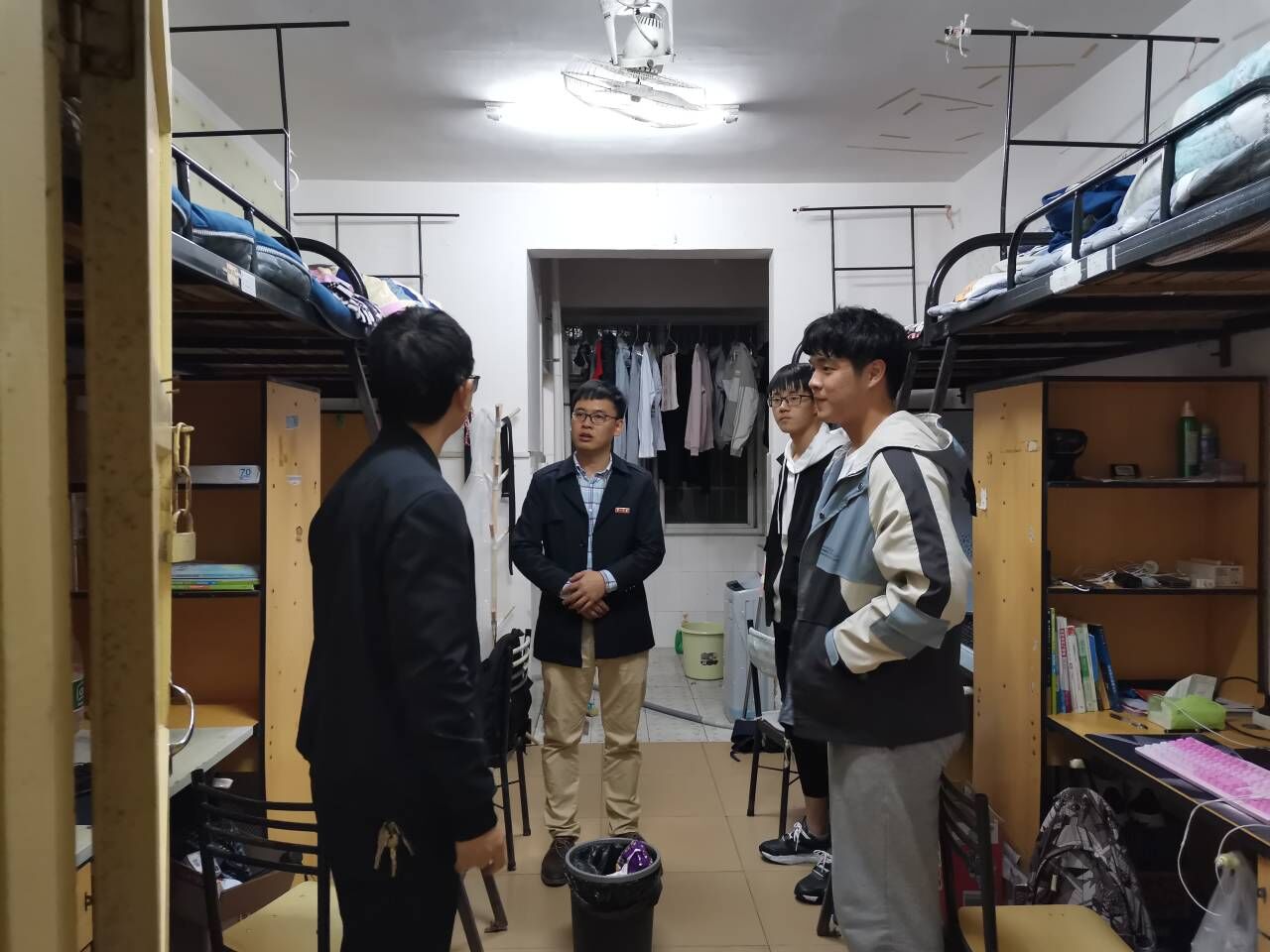 2020年10月27日下午六点整,必赢官网党总支书记王杰文教授、副院长田祖伟教授、何向阳教授、党总支副书记成夏炎博士带领辅导员和学生干部到4栋、11栋、12栋、13栋、14栋学生宿舍看望学生,检查寝室学风、文明卫生、内务整理,进行安全隐患排查;详细了解学生近期思想、学习和生活情况,从寝室环境、学习氛围、文明礼仪等方面进行宣传和教育引导。