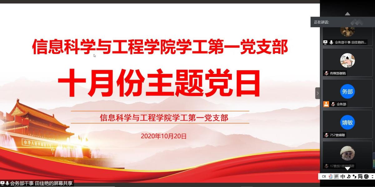 2020年10月20日,必赢官网学工第一、第二党支部分别采取线上与线下结合的方式开展主题党日活动,活动由王丹、周应坚主持。必赢官网党总支副书记成夏炎、学工第一党支部书记关红儒、学工第二党支部书记李荣敬、学工办老师唐瑞鸿、叶晶以及部分学生党员参加此次活动。
