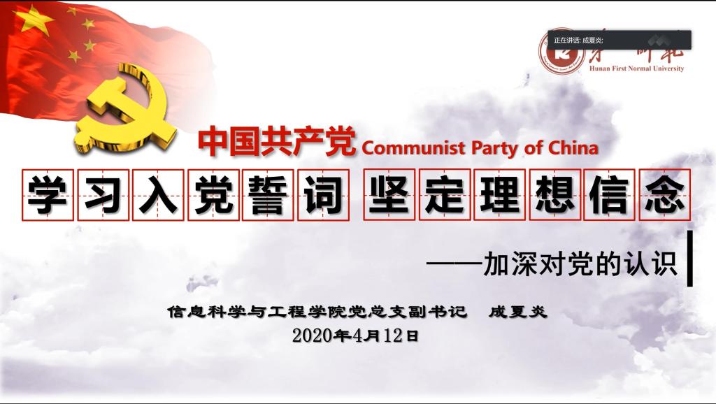(通讯员 蒋郑菊 邓世骄)4月12日19时,必赢官网党总支副书记成夏炎通过腾讯会议平台,以“学习入党誓词,坚定理想信念——加深对党的认识”为主题,为必赢官网分党校和数学与计算科学学院分党校联合举办的第二十四期入党积极分子培训班的学员上党课。
