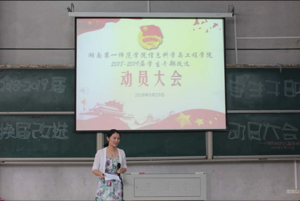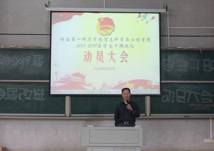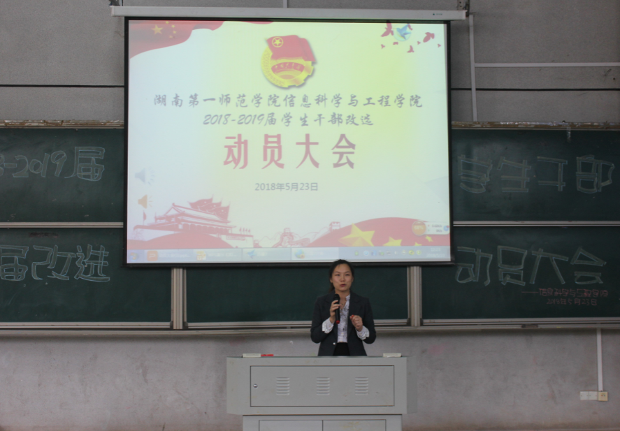 (通信员 向钰雪 邓力超 陈思迁)为推动必赢官网2016-2017届学生干部换届改选工作顺利完成,5月23日中午,信息科学与工程学院在文报厅举行了2018-2019届干部换届改选动员大会。学院党总支书记王杰文教授、党总支副书记易利老师学工办关红儒老师、唐瑞鸿老师、团学会全体学生干部和助理以及各班班长、团支书参加本次会议。会议由唐瑞鸿老师主持。