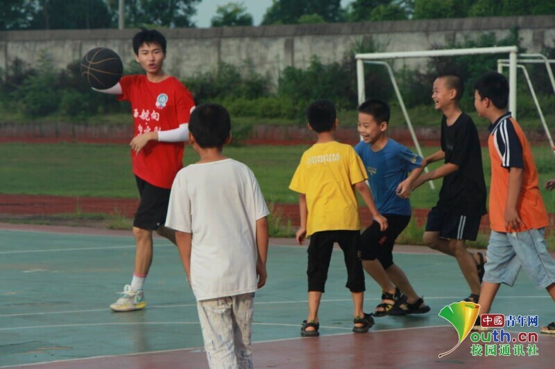 图为孩子与志愿者老师们第一次在球场上打篮球赛。中国青年网通讯员 何星逸 摄