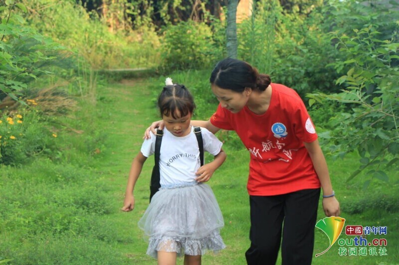 图为志愿者老师弯腰询问小女孩的住处,第一次护送孩子回家。中国青年网通讯员 欧阳健 摄
