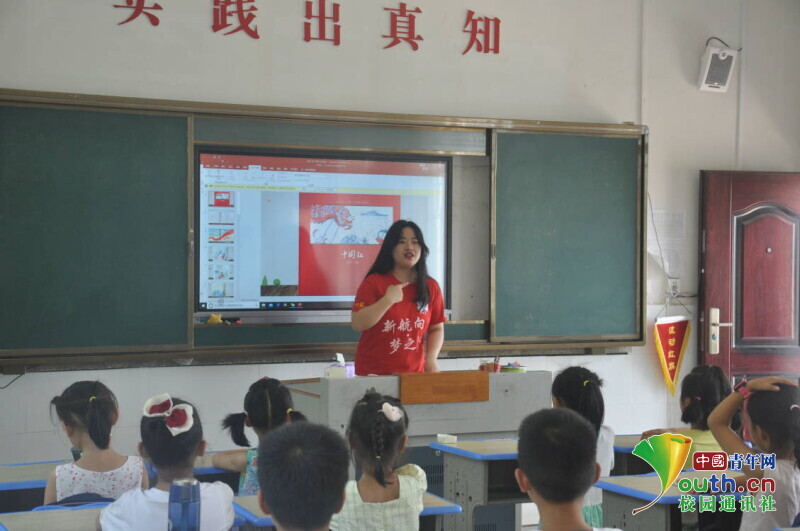 图为志愿者第一次走进真实的课堂,站在讲台上激情澎湃地为孩子们讲述红色故事。中国青年网通讯员 马唯一 摄
