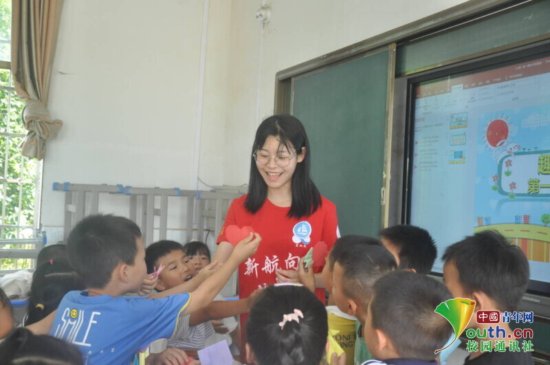 图为在手工课上,孩子们第一次将纸折的红心送给老师,志愿者也是第一次收到来自孩子们亲手制作的礼物。中国青年网通讯员 段新利 摄