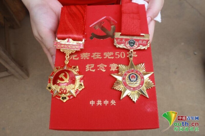 图为廖忠华同志向我们展示的“光荣在党50年”纪念章。 中国青年网通讯员 欧阳健 摄