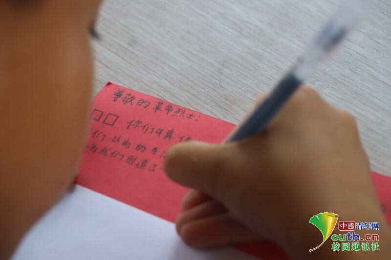 图为孩子们执笔用心写下对革命烈士的最真挚的感谢与崇敬。中国青年网通讯员 欧阳健 摄
