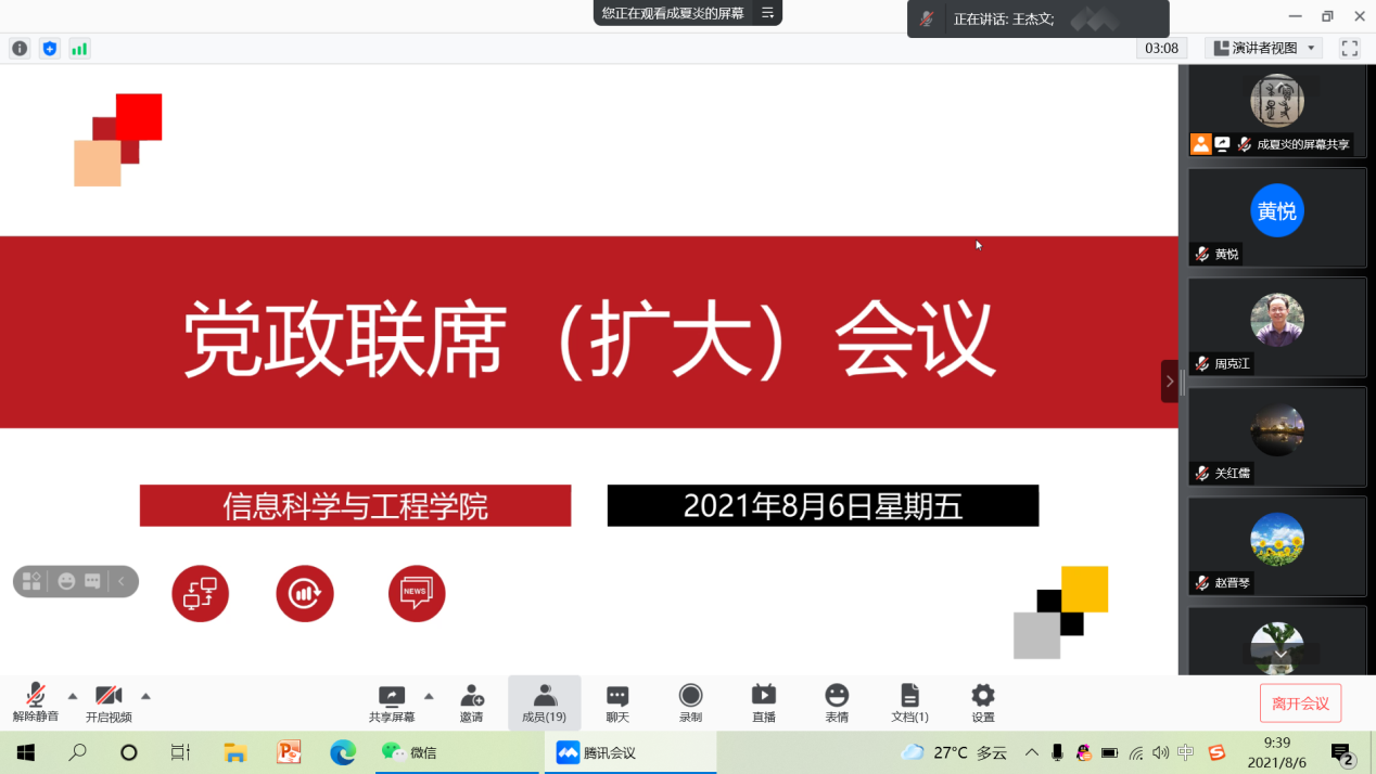 8月6日上午,必赢官网通过腾讯会议平台召开党了政联席(扩大)会议。会议由党总支书记王杰文主持,学院领导及班子成员、党总支组织员、三办主任、党支部书记、教研室主任及实验室主任参加。