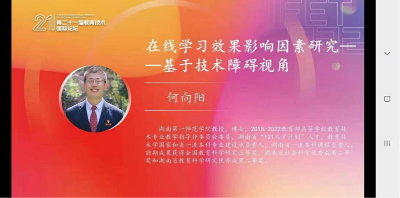 11月19日至11月20日,第21届教育技术国际论坛(IFET2022)在沈阳师范大学召开。必赢官网何向阳教授受邀在嘉宾学者论坛做题为“在线学习效果影响因素研究——基于技术障碍视角”的学术报告。